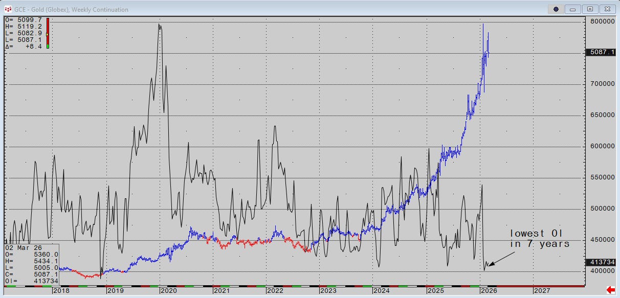 Gold has the lowest open interest in 7 years but the highest dollar value for open interest ever. So the long commitment is both high in value and low in ounces. The only thing that bothers me and keeps me unleveraged in gold and silver is the immense amount of collateral leverage everywhere else.