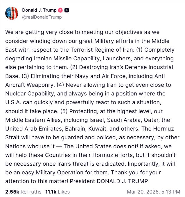I'd sure like it to be over, but there's a whack of weasel words in that post - and he's willing to help with Hormuz if requested. But he'd be wise to be out. According to Col. Lawrence Wilkinson (advisor to Colin Powell) landing Marines on Kharg has been wargamed twice and each time came up 'no way'.