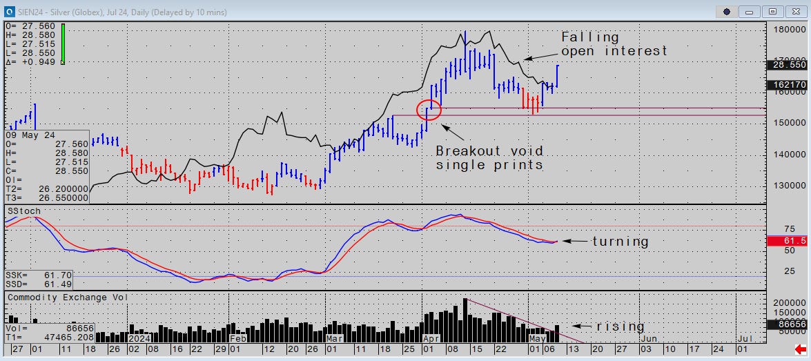 Now we know quite a bit more than we did on May 6. The correction has run its course in futures. Fifteen thousand lots of weak length is out, 15k lots of shorts have covered and the weak side of positioning was forced to pay up yesterday. The reason why the SHFE went from hot to cold abruptly in mid-April is not relevant. However, we can say with a degree of confidence that longs with bad location who bled out on declining volume these past 4 weeks are gone. SHFE specs were buyers last night.