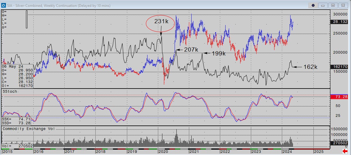 (Silver in weekly data illustrating the OI data noted above). Remember this when you listen to Buffett and Munger in the clip below.