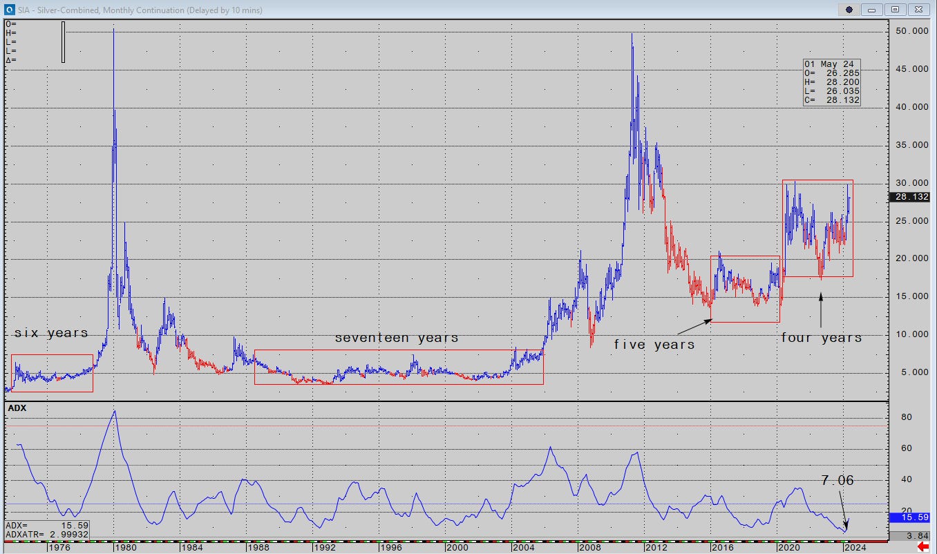 Next below is a 50-year chart in monthly data. I’ve isolated periodic range compression preceding silver’s two episodic rallies. There is no symmetry to them other than a violent history of rinse-repeat 31 years apart. Silver has been ‘rinsing’ for 13 years and it’s possible we are approaching the next repeat, imo. Maybe now, maybe next month. We failed at 30 three times and we’re back again.