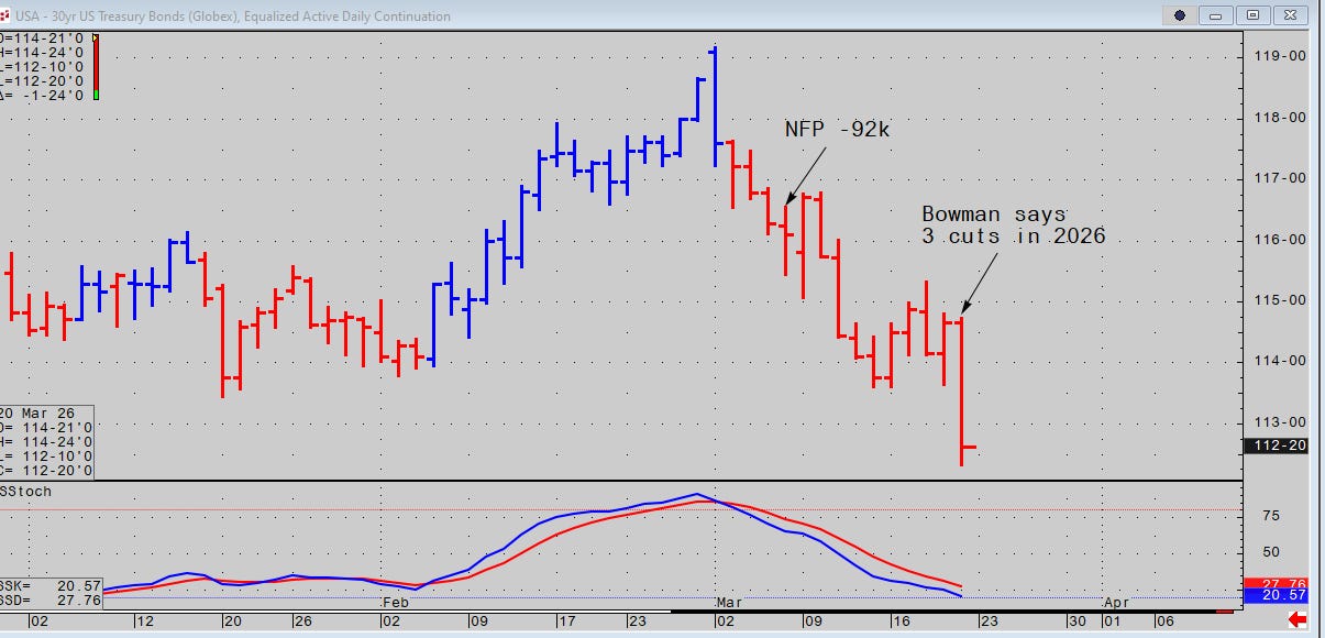 The United States is the world’s largest producer of oil and gas in the world. This conflict only enhanced that status and the practical safety of US Treasuries. Financial data has been docile. The financial community has been forecasting 3 cuts in 2026. Gundlach was sanguine about inflation after the FOMC presser and futures prices on the NYMEX have been almost blasé.