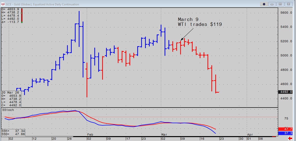 On March 18 when gold broke $5000 and settled at $4960.00 I wrote, “If gold is a safe haven it is useless in times of stress if not deployed to a purposeful remedy” (meaning…GCC selling). That evening in the wrap I finally said it in plain spoken terms: “When gold actually goes down at the onset of an oil war in the Middle East, the raison d’être for owning gold fails. When it goes lower as the war intensifies and the Strait of Hormuz is closed… that is a bearish divergence. I have opined recently the GCC nations might be selling gold and bonds to meet a shortfall of cash flow.”