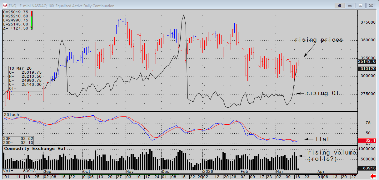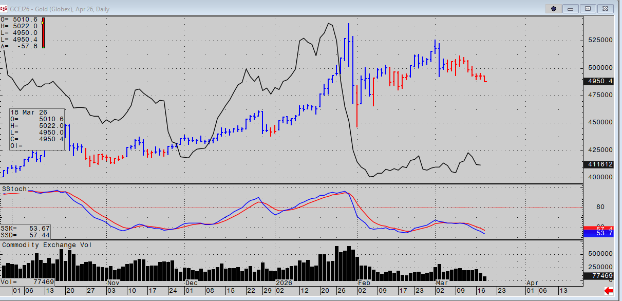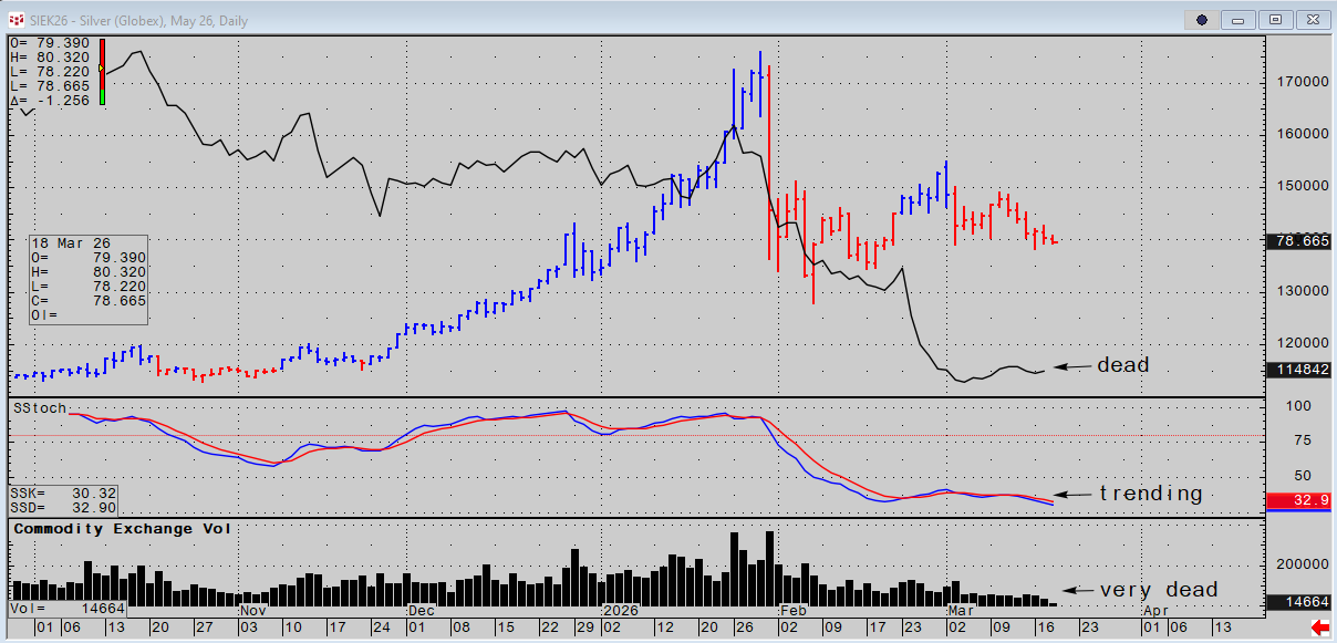 Gold is developing lower albeit in muted ranges and extremely low volume. Open interest is flat to down, oscillators are trending lower. Depending on location of length an investor might ignore it. The risk is as I pointed out last night a cash panic across markets as the strait stays shut. If gold is a safe haven it is useless in times of stress if not deployed to a purposeful remedy.
