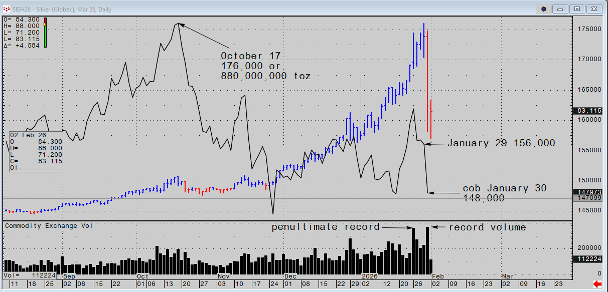 Open interest in silver fell about 8K lots on record all-time volume of 369,000 lots on Friday. I would liken this to a starving billionaire paying 5 million dollars for an anorexic boiled chicken and getting some bones and gelatinous skin with a glass of tap water to sate his appetite. Ranges are still off the charts. It’s likely the sellers have been aggressively buying. If true, the shortage of futures is going to be even more acute than ever.
