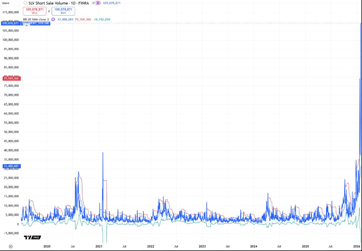 “SLV Short Sales Volume just went to heaven. There is no other way to describe the volume of short selling activity on January 30, 2026. Via Bob Coleman on X (good follow).” I asked Grok about it and apparently it was Reg SHO compliant with 5 days to borrow the shares.