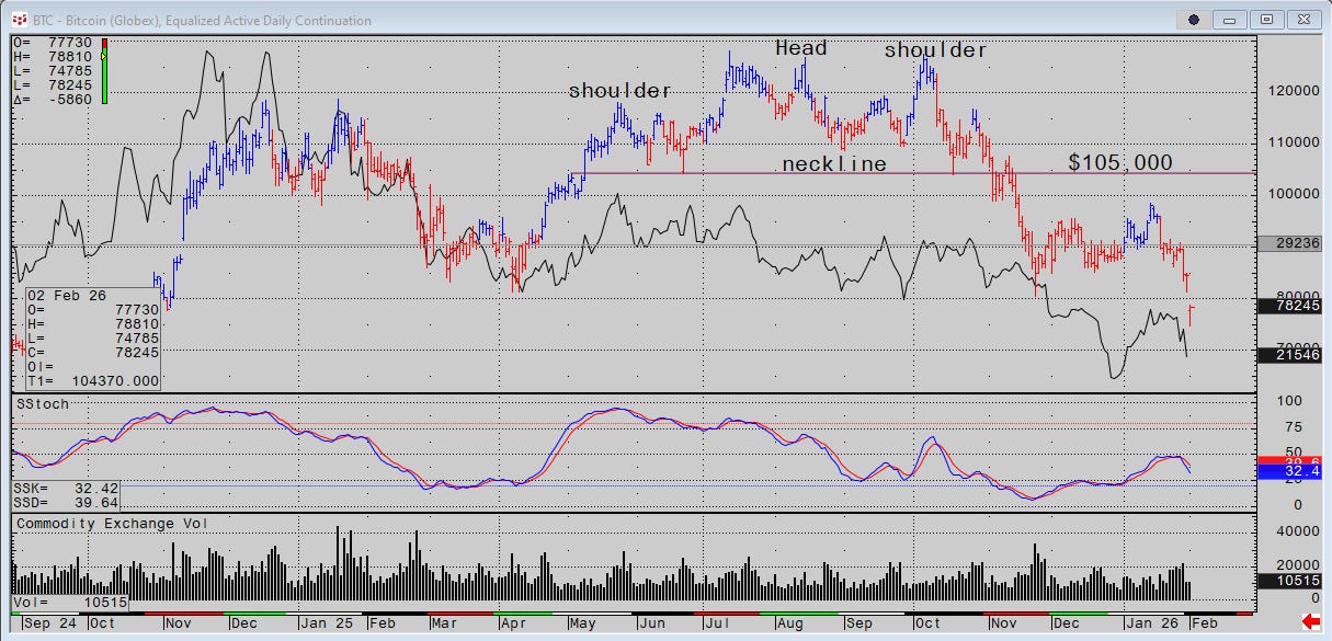 The BTC head-and-shoulders formation is developing normally. The neckline is at $105K. My guess is whether or not Saylor survives… from whatever level this bear bottoms out… we’ll test the neckline before bitcoin either goes to the junk pile or finds its lost mojo. There is too much horsepower committed to bitcoin to just let it die. If powerful forces in the markets can put silver down 40% in a single session, they can try to save bitcoin.